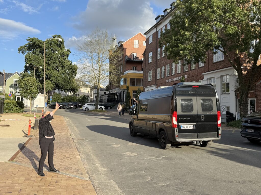 Vi kikkede rundt om bilen og syntes den holdt fint og stødte ind i en krøllet mand fra den grønne varevogn. Han var ved at forlade stedet, fordi han var chokeret over den modtagelse, han havde fået, og følte sig fuldstændig overhørt og rundt på gulvet. Han blev helt opløftet af, at vi var enige med ham i at se lidt fleksibelt på: vinkelret. Han blev natten over.